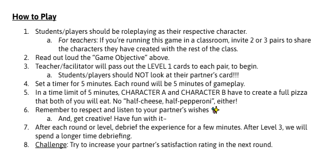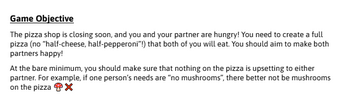 Ordering pizza by yourself? Easy, you know exactly what you like. Ordering pizza with someone else? That can get tricky. This game is about negotiating your wants, willing-to-try’s, and needs when it comes to... pizza, of course.